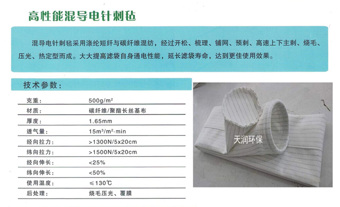 _除塵濾袋用濾布均采用(在生產針刺氈的基布的經紗中并入導電纖維紗或在化學纖維中混入導電纖維等導電材料的)_滌綸針刺氈制作,具有很好的_性能,用于面粉塵、化工性粉塵、煤粉塵等如遇靜電放電有爆炸可能的行業,是目前防爆收塵的選擇。